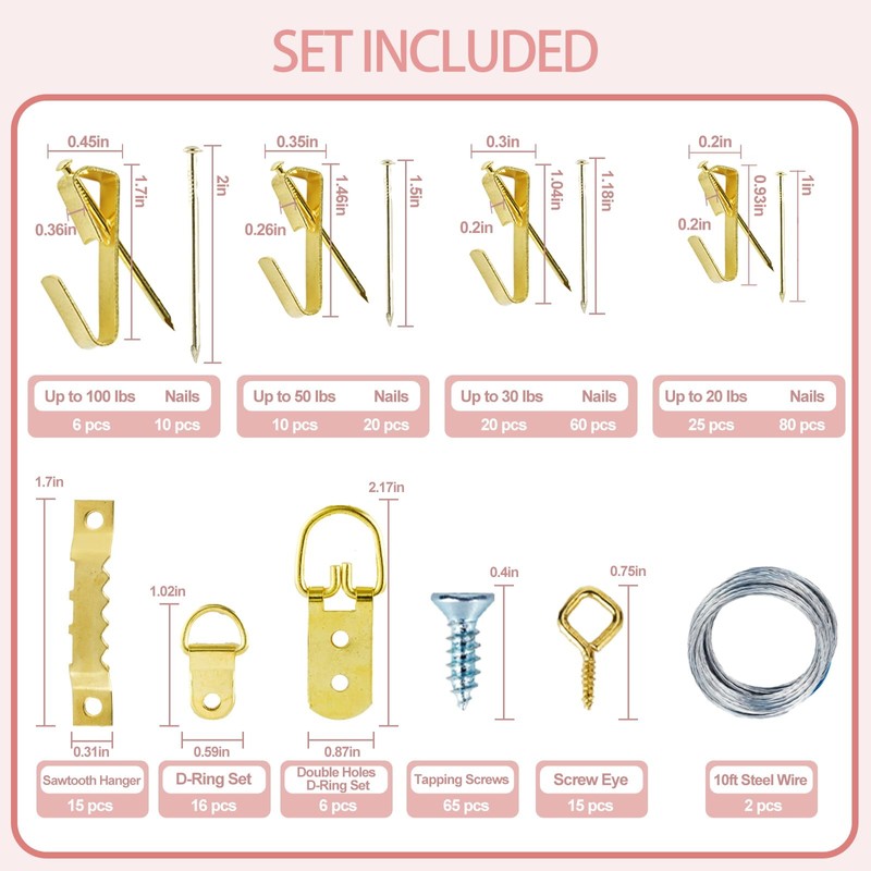 - Quality Assurance and Customer Delight: Immerse yourself in unrivaled quality and exceptional service. The kit incorporates top notch materials like picture hanging wire, hanging nails, and Tapping Screws for longevity. Beyond purchase, our commitment extends to dedicated after sales service, ensuring your satisfaction. Trust in the quality, transform your space effortlessly and enjoy the hanging experience with ease with our frame hanging kit