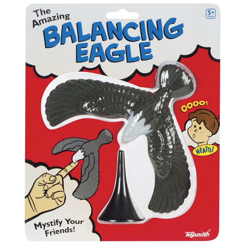 The Balancing 7" Eagle by Toysmith balances on your fingertip by its beak or the included stand. Spin it, tip it's wings this eagle will amaze you and your friends. Ages 5 and up.