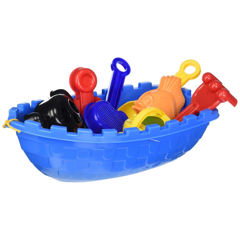 - The set includes 9 beach toys including a shovel, sand sifter, rake, watering can, and four sand molds