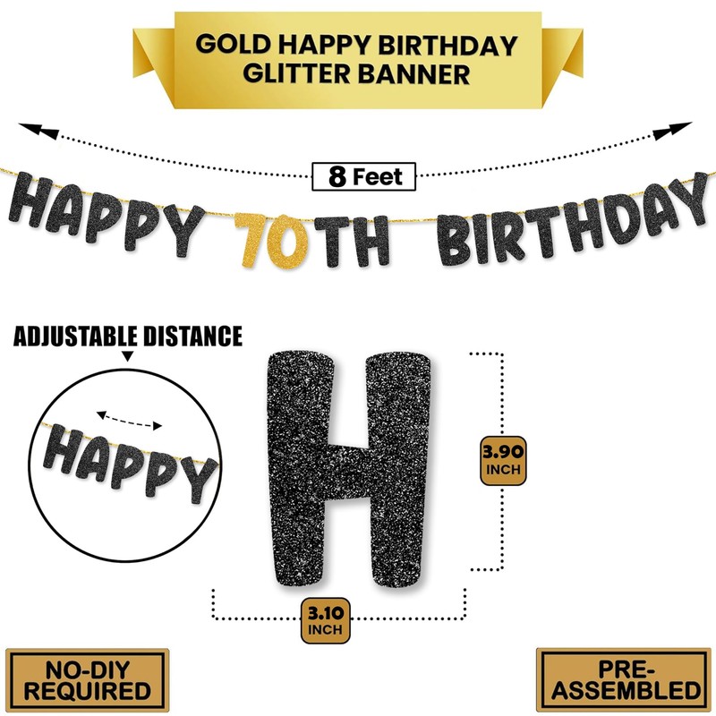 - GLAMOROUS GOLD GLITTER FINISH – The dazzling gold glitter letters on this 70th birthday banner shine beautifully in any lighting, adding a touch of luxury to your celebration. Perfect as a 70th birthday decoration that’s eye-catching and elegant, it’s ideal for photos and videos.