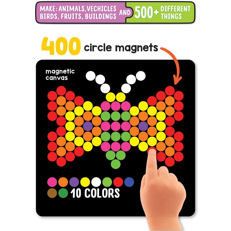 - 🧲 Create with 400 Colourful Magnets – Kids can build fruits, animals, birds, vehicles and endless imaginative designs using 400 circular magnets in 10 colours on the included magnetic board.