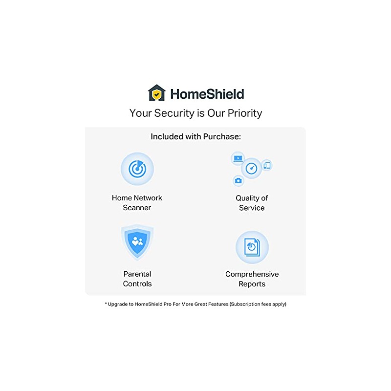 - TP-Link HomeShield - TP-Link's premium security service keeps your home network safe with cutting-edge network and IoT protection. Free features: 1. Basic Network Security including Security Scan and IoT Device Identification 2. Basic Parental Controls 3. Quality of Service 4. Basic Weekly/Monthly Reports. Visit TP-Link website for more information.