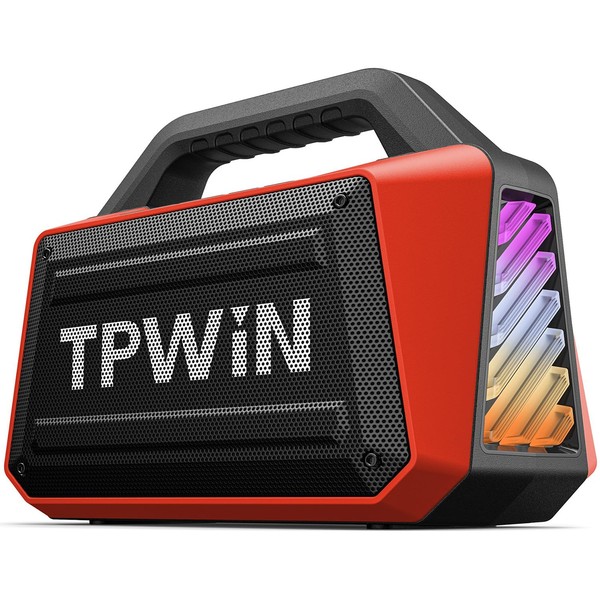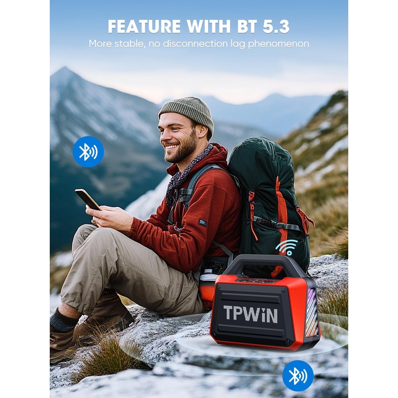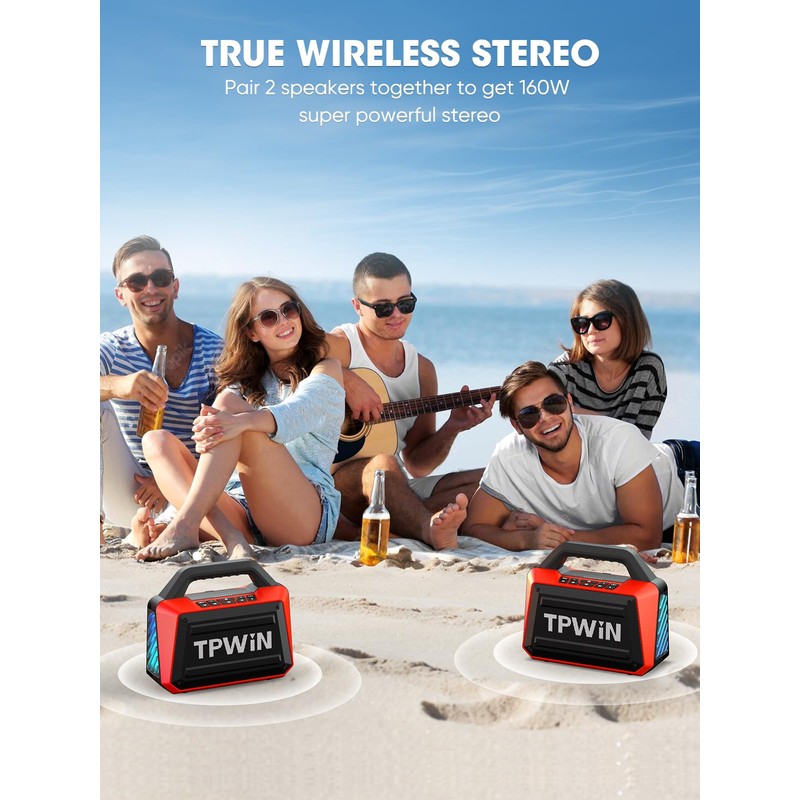 - 【80W Max Booming Sound】TPWIN bluetooth speaker built in 2 x 25 W(peak) strong subwoofers and 2 x 15 W(peak) tweeters. Subwoofers make the bass is shocking and powerful, tweeters make the treble is crisp and clear. Portable speaker also equipped with advanced audio technology, gives you the best listening experience anywhere! Like jobsite, camping, beach, roadtrips.