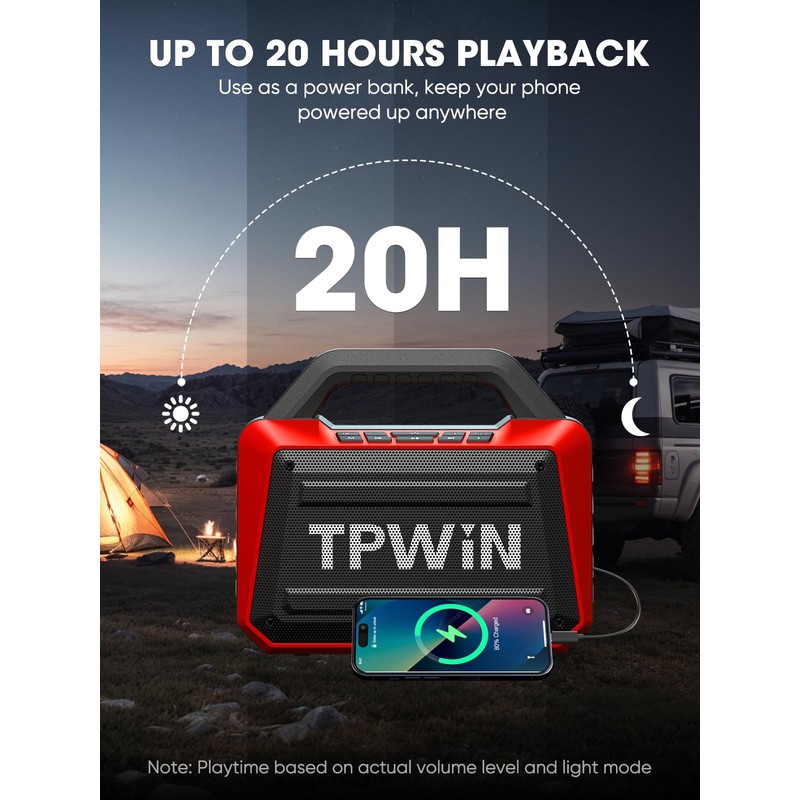 - 【20H Playtime & Power Bank】TPWIN wireless speaker equipped with a 10000 mAh high-capacity battery, without frequent recharging and meets your music playback needs for a whole day. You can use this wireless speakers with bluetooth as power bank, keep your phone powered up wherever you are. (Playtime based on actual volume level and light mode.)
