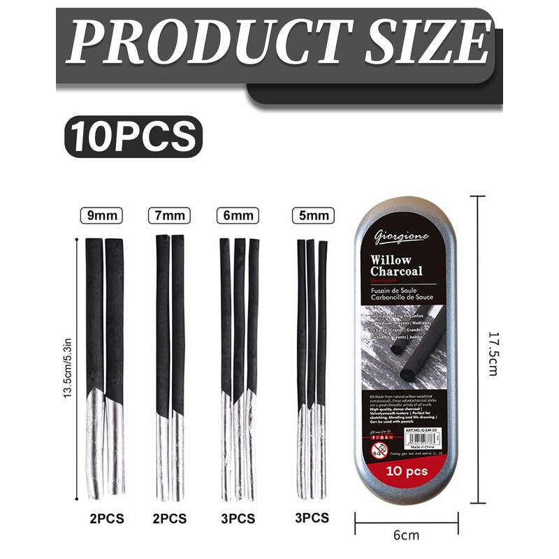 - Verschiedene Größen: Ein Set enthält 10 Stücke Weidenkohle mit 4 verschiedenen Durchmessern, nämlich 3 Stücke à 5 mm, 3 Stücke à 6 mm, 2 Stücke à 7 mm und 2 Stücke à 9 mm, um verschiedenen Zeichenanforderungen gerecht zu werden.