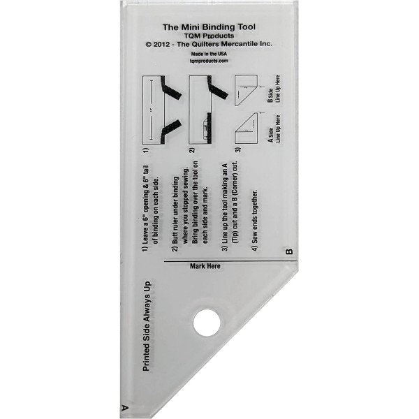 The Mini Binding Tool designed by Susan Brown is a 'must-have' tool for your smaller quilt projects that use 2? binding like miniature quilts placemats potholders bibs and bags! With all the great features of the regular sized Binding Tool this nifty tool will work to reduce the bulk of the seam. The acrylic Binding Tool makes a perfect ending every time. Two measurements two cuts and you're on your way to a great finish!