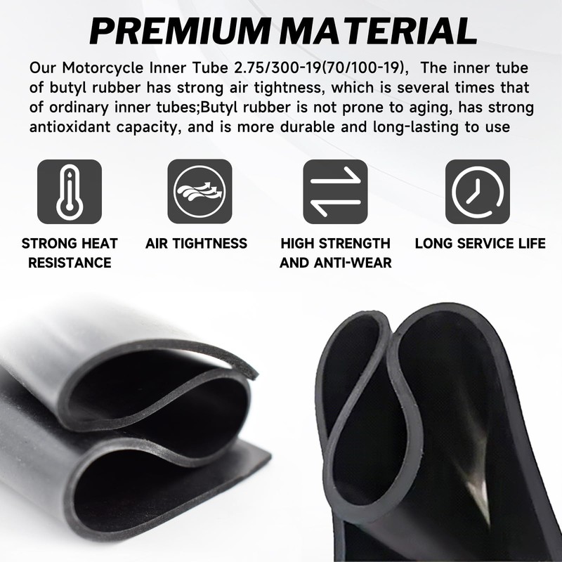 - Premium Material:Our Motorcycle Inner Tube 2.75/300-21(80/100-21), The inner tube of butyl rubber has strong air tightness, which is several times that of ordinary inner tubes;Butyl rubber is not prone to aging, has strong antioxidant capacity, and is more durable and long-lasting to use