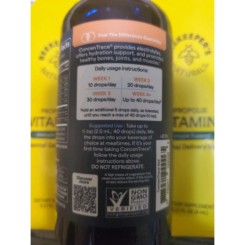 Provides Essential Hydration Naturally Supports & Sustains Energy Dietary Supplement Daily Foundation For Health 48 Day Supply Drops Feel the Difference Guarantee Non GMO Project Verified Gluten Free Kosher Certified Vegan BPA Free cGMP Facility Third Party Tested Certified Halal ConcenTrace® provides electrolytes, offers hydration support, and promotes healthy bones, joints, and muscles.SUGGESTED USE:
