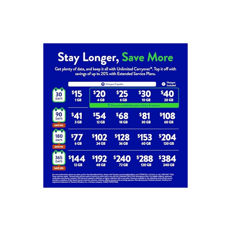 Unlimited Talk & Text is great. But add in 12 GB of data, and this 365-Day Plan from Tracfone just got even better. More months means more savings. Save 20% with this Tracfone one-year Extended Service Plan. Now you're in control with no contracts, no bills, no hidden fees, and NO surprises. Plus, every Tracfone plan comes with Unlimited Carryover, so you keep unused monthly texts, minutes or data* for when you need them most. 3-in-1 SIM (Nano/Micro/Standard). Terms & Conditions: *Unused data will not expire if service is active and in use with the Unlimited Talk & Text Smartphone Plan. ≈ Plan can use entire high-speed data allotment for hotspot usage counted against current data allotment. Compatible device required. Tracfone is a registered trademark of TracFone Wireless, Inc., a Verizon company. 2024 VERIZON.
