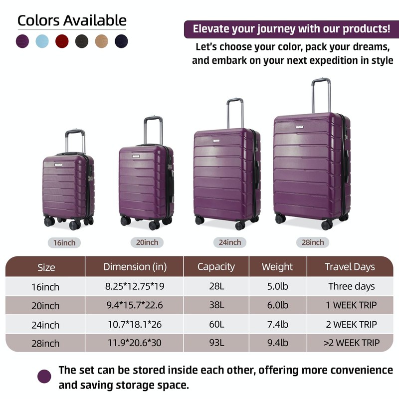 - 4 PIECE LUGGAGE SET: The affordable luggage sets include a 16-inch under-seat carry-on luggage, a 20-inch carry-on luggage, a 24-inch checked luggage, and a 28-inch checked suitcase, all in one set. Stylishly designed, it makes travel effortless. The 16" and 20" can be easily taken aboard the plane only, ensuring a convenient travel experience. The 24" and 28" models feature an expandable design, providing up to 25% more capacity. Capacity:16in28L, 20in38L, 24in60L and 28in93L