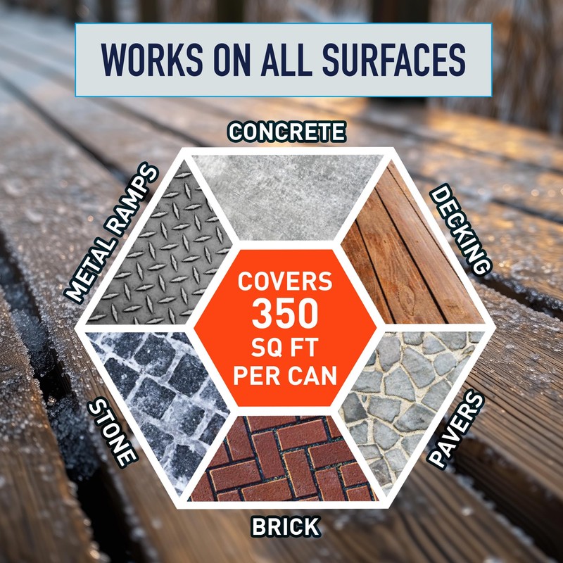 - Surface Safe - 100% safe on all surfaces including decking, new concrete, pavers, etc; Anti-skid - Creates an instant skid-free, slip-free surface on ice and snow for foot traffic, pet traffic, car traffic and more.