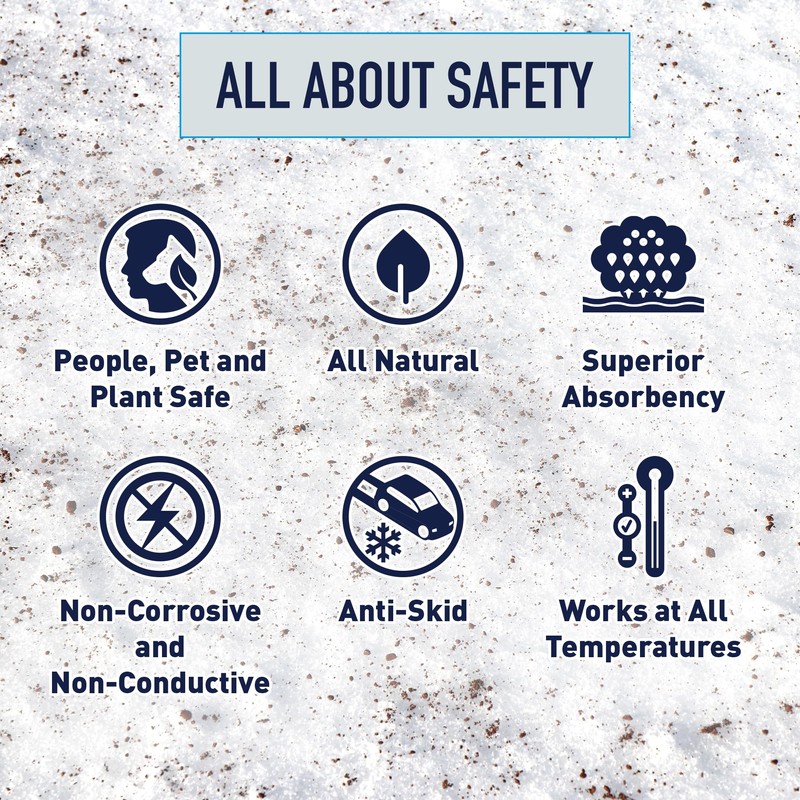 - Instant traction on ice and snow; People, Pet & Plant Safe - Safe on eyes, skin, paws and if ingested. It’s all-around safe!