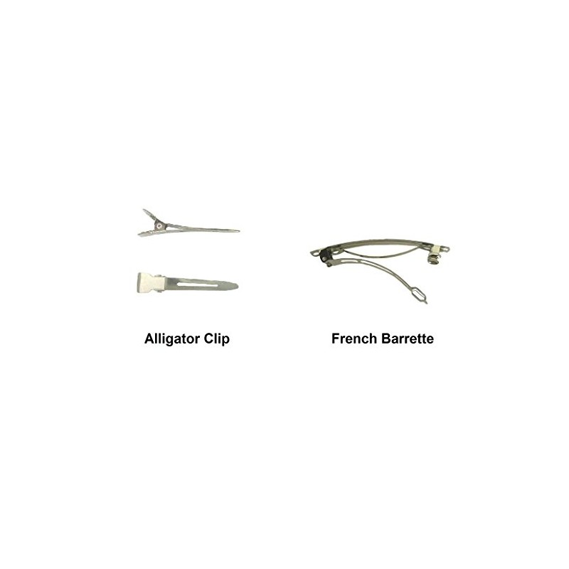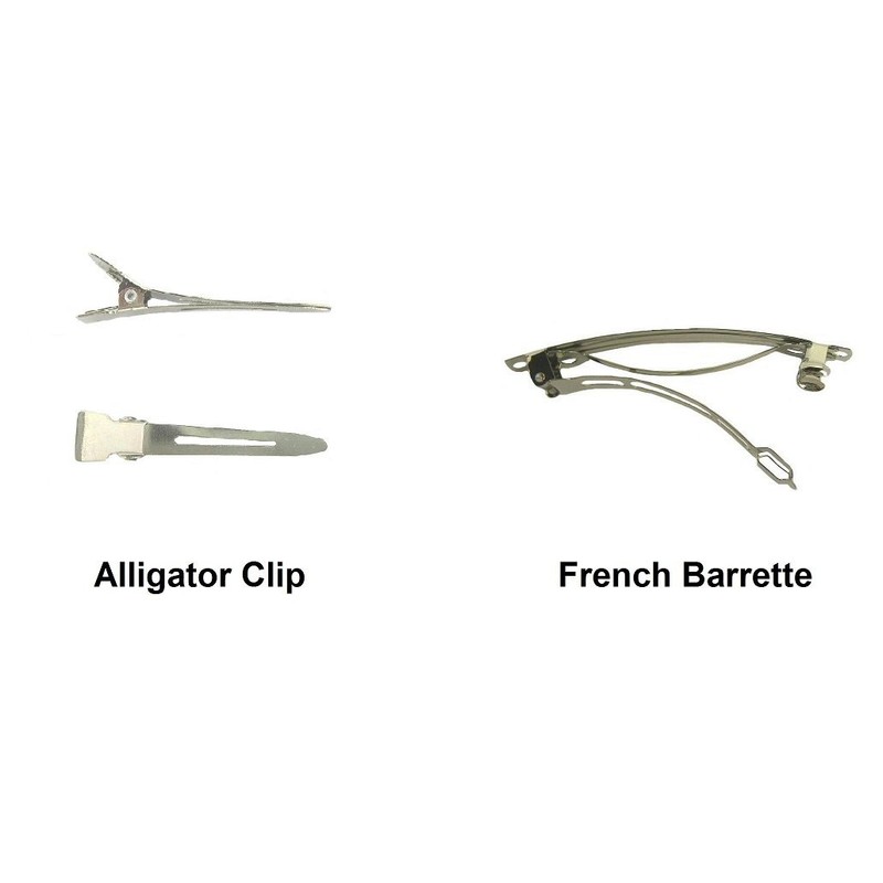 These bows come 2 in a set. They can be mounted on small french barrettes OR partially lined alligator clips. Each set consists of one bow for the right side of the head and one bow for the left side of the head. Each of these bows measure 3.5 inches wide by 3 inches high.