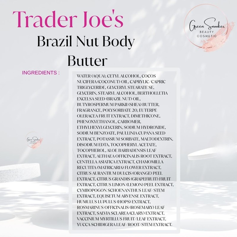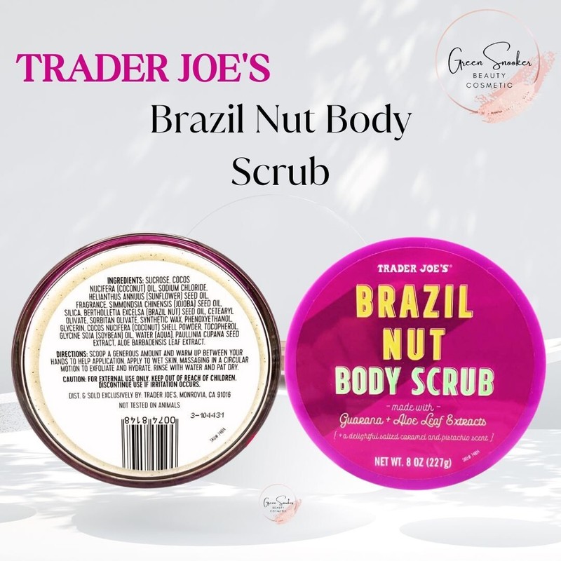 Trader Joe’s Brazil Nut Body Butter! Yes, folks, your ideal summer skin smoother is here! Thick, rich, and smelling of summer, this mega moisturizer is crafted with an impressive list of ingredients, including coconut oil, shea butter, açai extract, guarana extract, and, of course, bertholletia excelsa seed oil a.k.a. Brazil nut seed oil. Flip open the hot pink lid to release the intoxicating scent of salted caramel, pistachio, and beachy notes of coconut and vanilla.