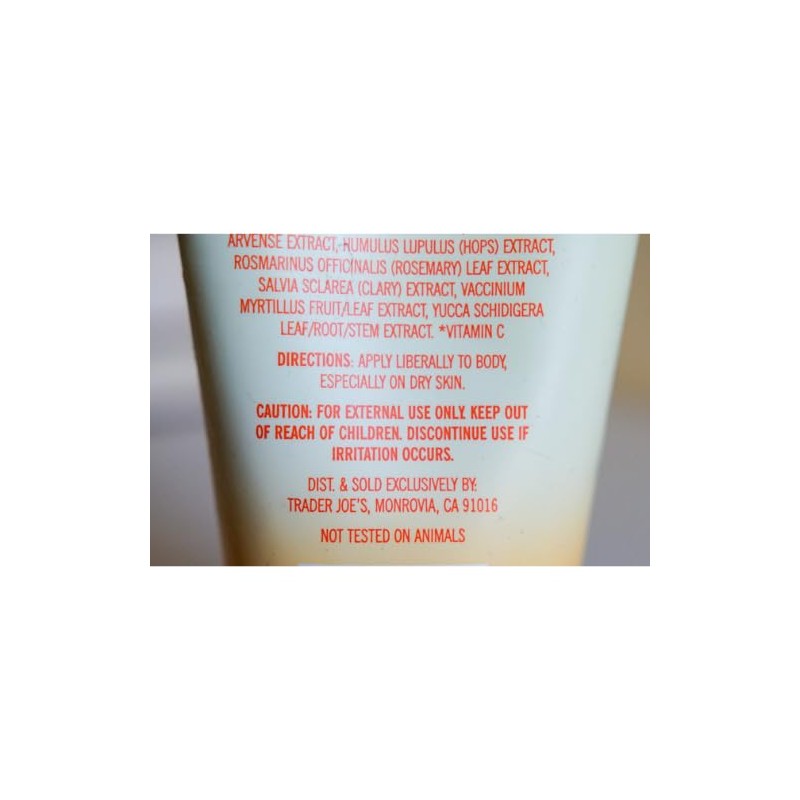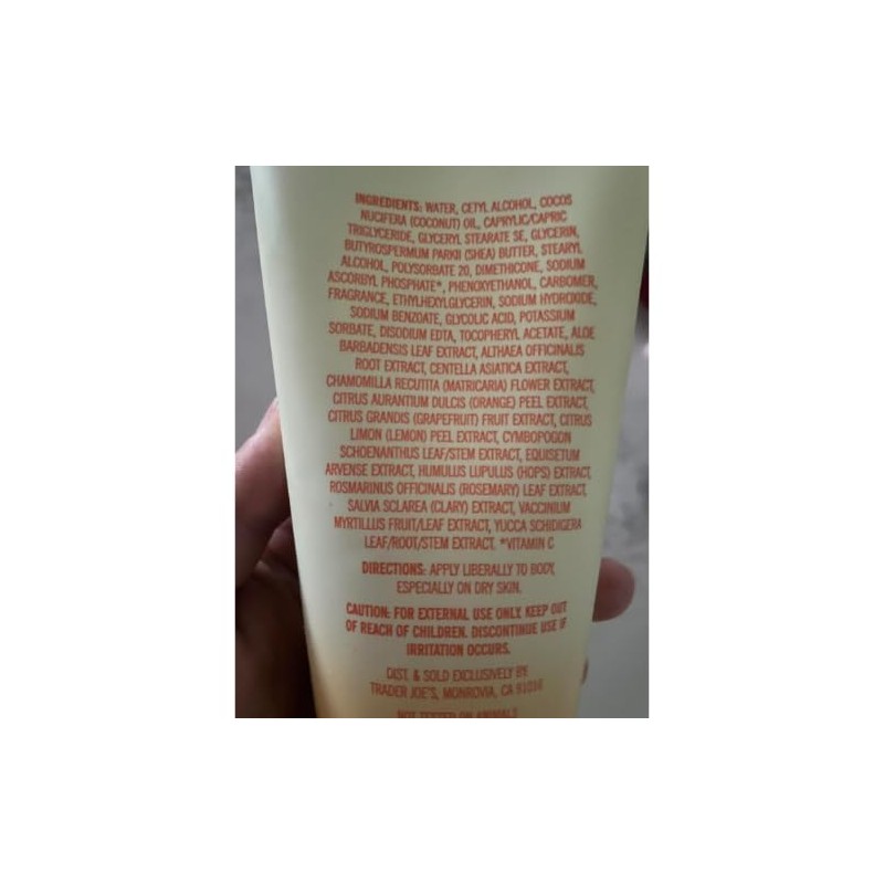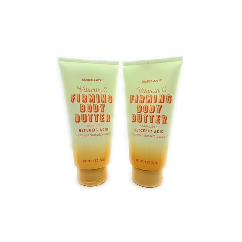 Trader Joe’s Vitamin C Firming Body Butter 8 Oz (Pack of 2) Bright, fresh clememtine scent Non-greasy formula Vitamin C hydrates, boosts collagen, and improves the appearance of wrinkles, dark spots/hyperpigmentation, and scarring Glycolic acid helps remove dead skin cells and encourages new cell growth while moisturizing