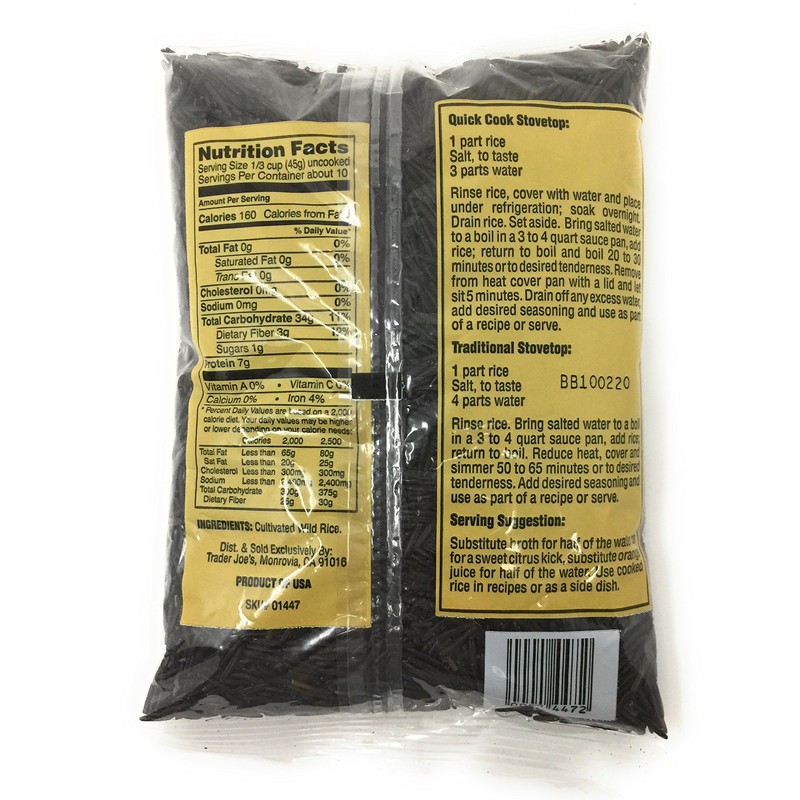 The key to crafting an exceptional wild rice dish is in the caliber of the kernels. From California's Fall River Valley, Trader Joe's Wild Rice thrives in the fertile clay soils, clean air and crisp waters that flow from Mt. Shasta. The rice grains are dark, slightly glossy, and uniform in length - all good signs of quality wild rice. We cooked up a batch and were rewarded with chewy bits of burst rice (a good thing!) that had a deep nutty and grassy flavor. They work closely with the growers to ensure consistent quality. A one pound makes between 16-22 servings.