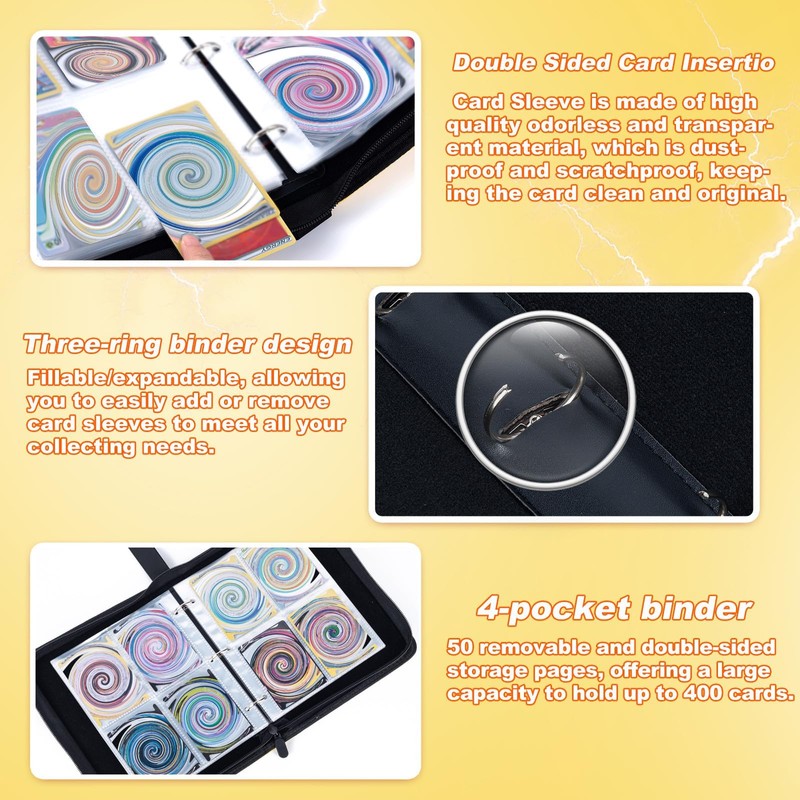 - Large Capacity Trading Card Binder: 50 sturdy pages of sheets can hold up to 400 cards. 4-pocket binder designed with double-sided pockets. Maximising storage without taking up space - hold twice as many cards in half the space. Ample storage keeps cards organized and easily accessible. Card collection binder keeps your cards neatly arranged for easy access, reducing clutter and risk of damage.