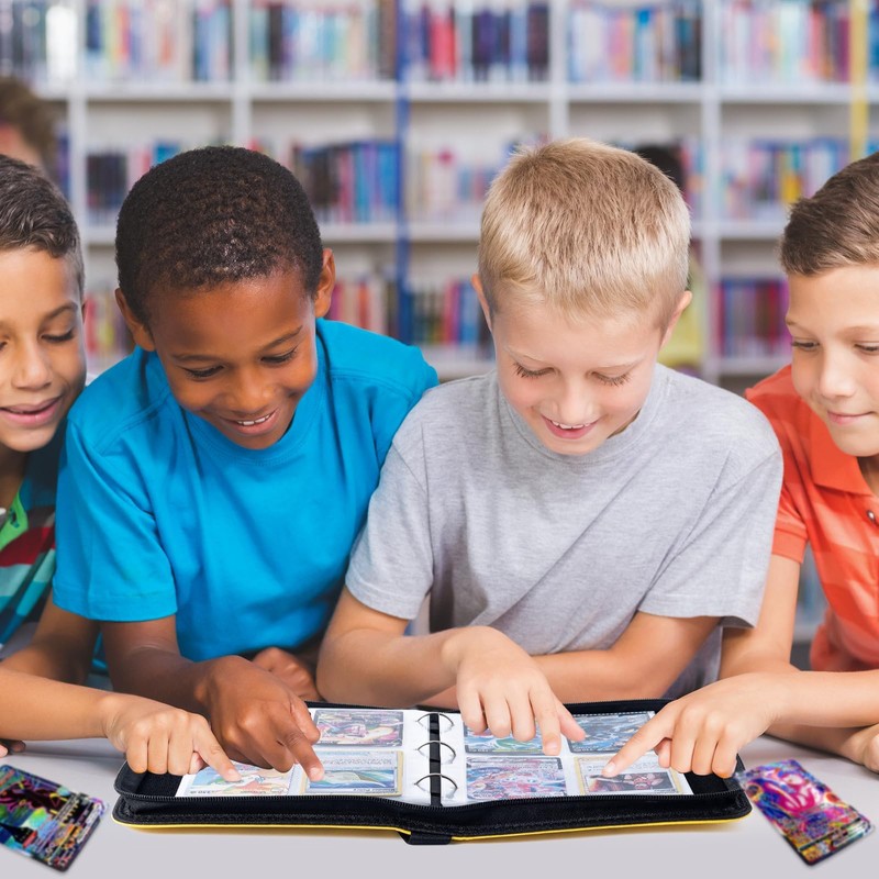 - Portable Card Holder Binder: Card binder 4 pocket size: 9.4''x 7'' (24 x 17.7cm). Inner pocket size: 3.7'' x 2.8'' (9.5×7cm). Card collector binder for all standard cards, allowing smooth insertion/removal without snags or slippage. Reinforced metal binder rings enable effortless page-turning and secure sleeve adjustments. Trading card album is just a right size for kids or adults to carry around with a wrist strap.