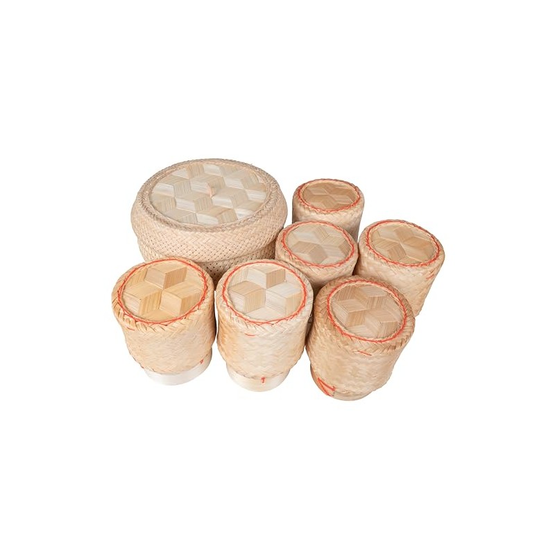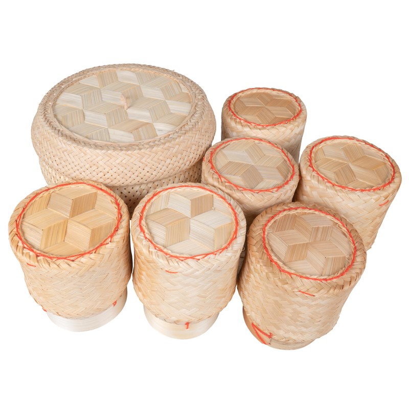Traditional Handmade Bamboo Sticky Rice Basket - Serving Basket for Rice (Set Steamer-6 Round)