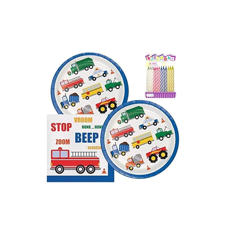 - TRAFFIC JAM PARTY PACK – These complete decorative birthday party plates and napkins set are themed as one of your child’s favorites. These happy birthday plates and napkins feature your childs favorite vehicle