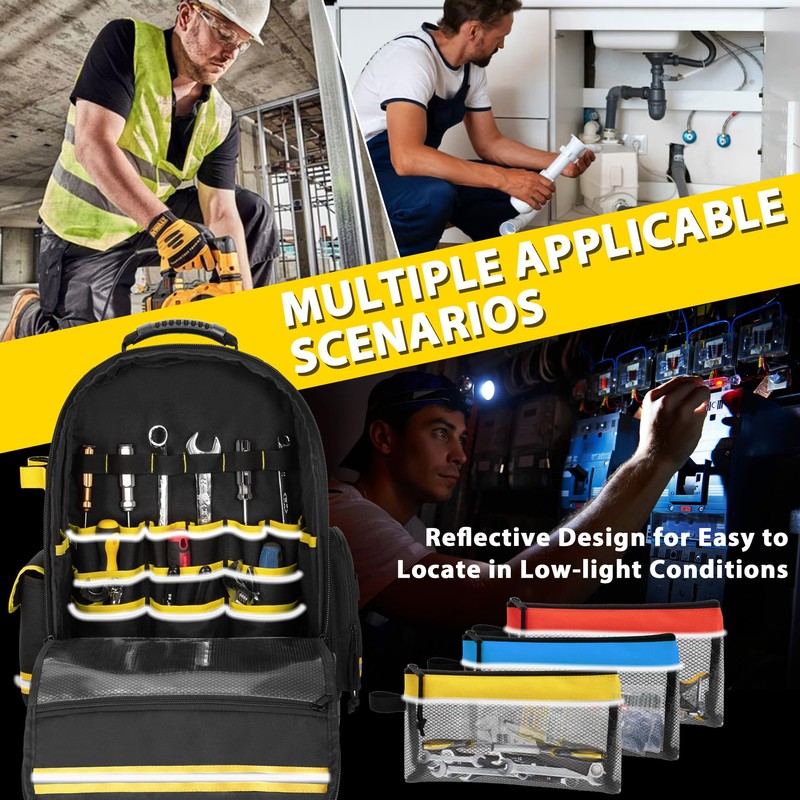 - ACCESSORY POUCHES: This tool bag includes 3 clear accessory pouches (10"L × 5.5"H) for organizing screws, caps, electrical tape, and small components, with contents visible without unzipping. Reflective strips on the backpack's exterior, inside pockets, and small pouches ensure easy tool visibility in low light conditions.