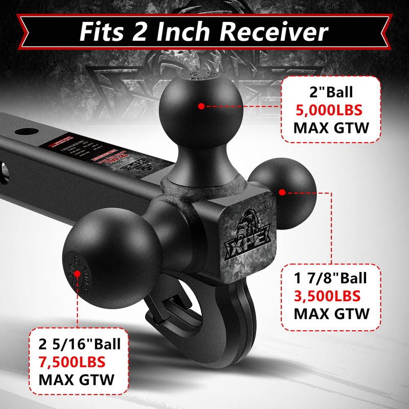 Trailer Hitch Tri Ball Mount with Hook,Fits 2” Hitch Receiver,1-7/8", 2"& 2-5/16"Matt Black Plated Balls ,Secure with Self-Lock Latch, 10,000 LBS GTW,for RV,SUV, ATV and Truck etc