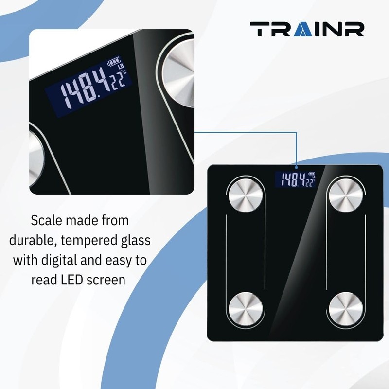 Trainr Digital Body Scale Trnr-BDYSCLE-BLK, Home Essential Body Weight Scale for People, Durable Bathroom Accessory, Smart Scale Compatible with Apple and Android OS, Workout and Fitness Equipment