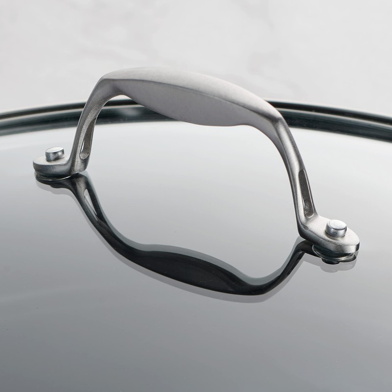 - Heat- and shatter-resistant tempered glass lid with wide stainless steel rim