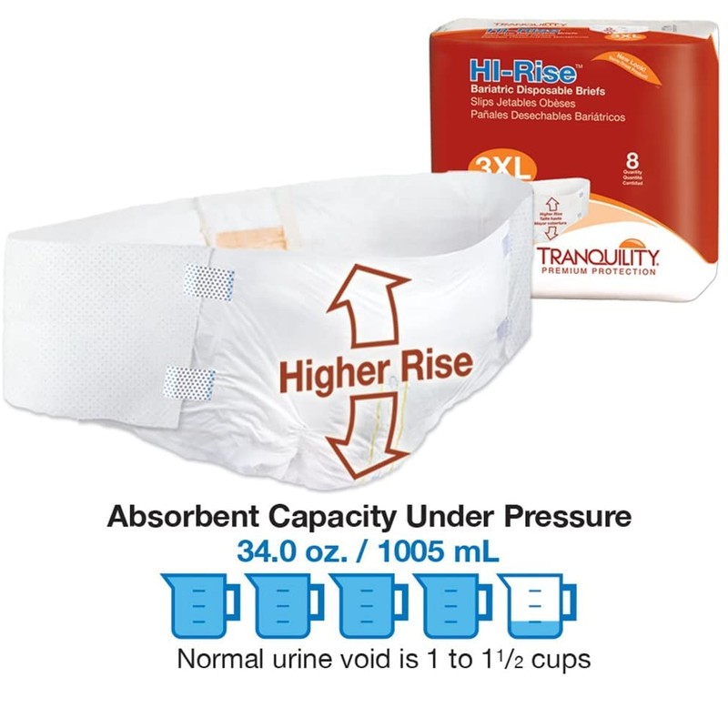 - TRANQUILITY HI-RISE BARIATRIC BRIEFS feature an extended front and back waist rise with breathable, stretchable side panels for premium comfort. Latex-free, 34 ounce Cups capacity, Waist/hip 64 to 96 inches, Weight 250+ pounds, Adult 3X-Large, 32ct Case