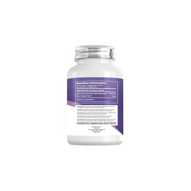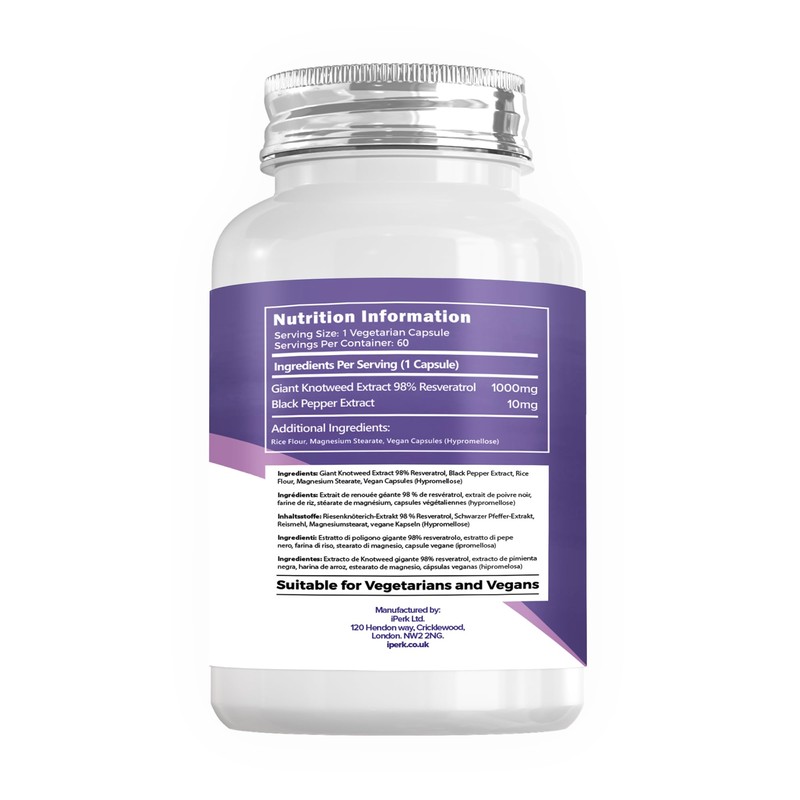 IPERK PRODUCTS UK MADE HIGH MANUFACTURING STANDARDS - We use only the highest-grade ingredients with an established manufacturer. You can buy with Complete Peace of Mind. Vegetarian and vegan-friendly TRANS resveratrol is a powerful, whole food resveratrol Gaint Japanese knotweed. Contains no filler ingredients, artificial colours or preservatives.