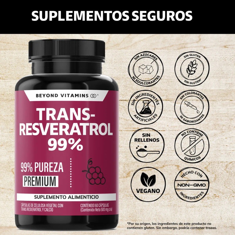 - Resveratrol 99%: Alta Concentración y Pureza Cada cápsula contiene Resveratrol Blanco con una pureza del 99%, una de las concentraciones más altas disponibles. Este potente compuesto es conocido por sus propiedades protectoras y revitalizantes, lo que lo convierte en un ingrediente esencial para el cuidado de la salud. Cápsulas Veganas de Calidad Premium Elaboradas con cápsulas de celulosa vegetal, este suplemento es completamente vegano y libre de conservantes y aditivos artificiales, adaptándose a todas las dietas. Beyond Vitamins utiliza ingredientes de máxima pureza y calidad para brindarte una opción limpia y eficaz. Fácil Integración en tu Rutina Con una dosis simple de una cápsula al día, puedes aprovechar los beneficios del Resveratrol de manera práctica y conveniente. Perfecto para quienes desean mantener una rutina de bienestar optimizada sin complicaciones. Beyond Vitamins: Más Que un Suplemento, Un Compromiso Esta fórmula de Resveratrol de alta concentración está pensada para acompañarte en el camino hacia una vida saludable, ofreciéndote un producto premium que puedes incorporar a tu rutina diaria con total confianza. Aviso legal