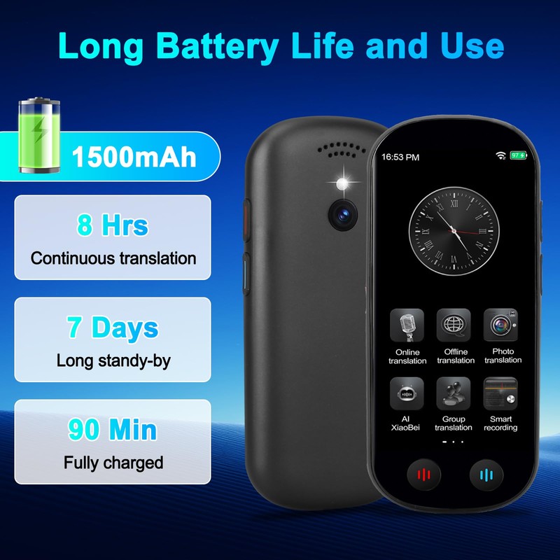 - đ±ăLong Battery Lifeă: Thanks to the 1500mAh battery, the translation device can work continuously for up to 8 hours and is fully charged in just 1-2 hours - perfect for travel, language learning or business trip.
