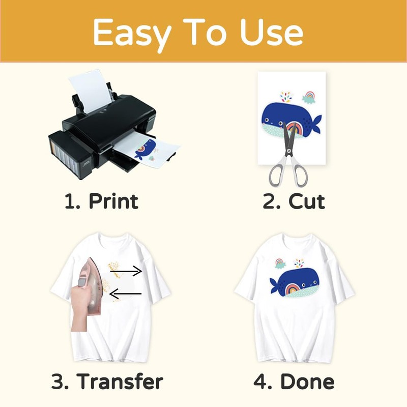 - 🎁EASY TO USE: [1] Print & Cut out your design. [2] Place the printed image facing DOWNWARDS onto fabric. [3] Transfer image with Iron or Heat Press. [4] Peel off the backing paper. Transfer has been done! Step-by-step instructions and videos are on the back of cover paper in the pack.