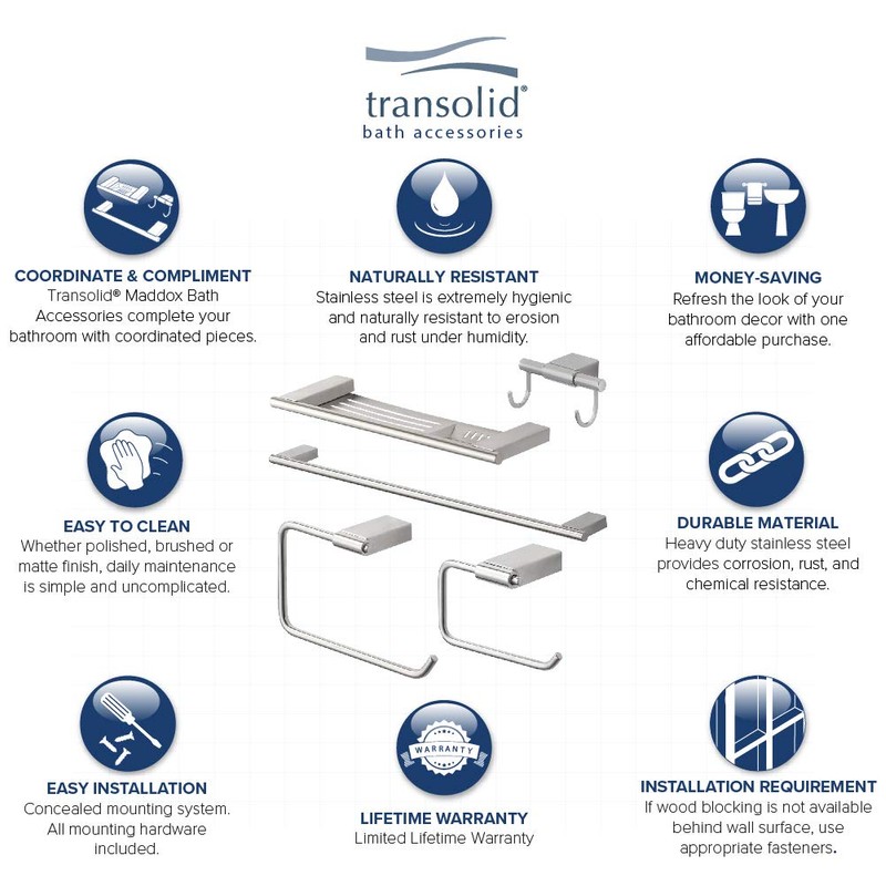 - Kit includes Transolid Maddox collection robe hook, toilet paper holder, towel ring, 24-in towel bar, and 16-in shelf with soap dish