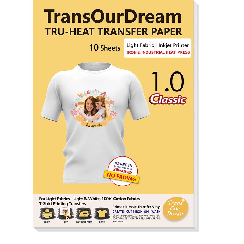 TransOurDream Tru-Light Transfer Paper Transparent Firm Iron on Transfers T Shirt Printing Inkjet Printer A4×10 Sheets Printable Heat Transfer Vinyl Classic Use (L-1.0-10)