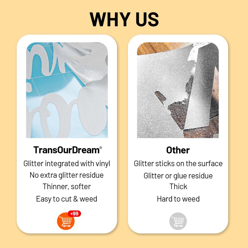- đź’•TRU-PU HTV: Made of eco-friendly PU materials -- thinner and soft that make it easy to cut and weed, sticky and strong stretchy which allows designs to feel incredibly lightweight! P.S. Please use colorfast fabric for transfer, in order to avoid the Glossy Glitter vinyl from being smudged by the color of fabric.