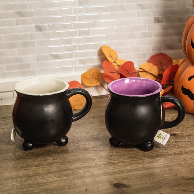 • (Set of 2); Add some bewitched charm to your living space with these spooky black cauldron mugs; Features purple and white interior finishes with sentiments ''I put a spell on you'' and ''You've been poisoned''
