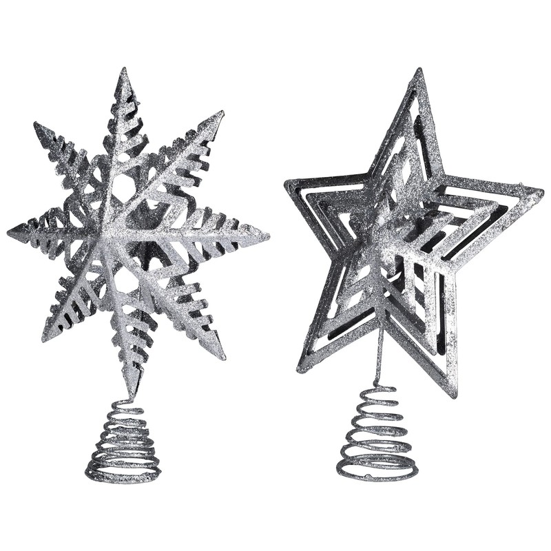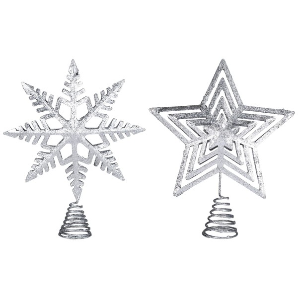 • Features a sparkling pair of tree toppers in glittering silver with open, 3D design; One is a pointed snowflake design and one is a multi-banded star; Both tree toppers sit on a spiraled wire mount