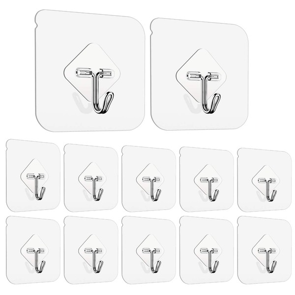 Transparent Adhesive Hooks Utility Hooks 44 lb/ 20 kg(Max), Heavy Duty Coat Hooks Waterproof and Oilproof Reusable Seamless Hooks, Reusable Wall Hook for Bathroom & Kitchen(12 Pack)