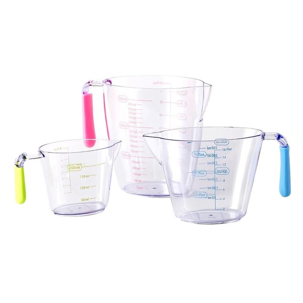 Complete Measuring 3 Cups Set: Our measuring 3 cups set includes ✅ Large volume (900ml/3.8cup/30oz), ✅ Medium volume (400ml/2cup/13oz) and ✅ Small volume (200ml/1cup/6oz). Fulfills most cooking and baking needs. Suitable for measuring flour, powder, or liquid. Measurements are printed on the measuring cup, convenient for your cookbook recipes. Convenient to Use: Printed Measurements and Pouring Spout with soft multi colour grip handles. Clear construction with easy-to-read measurement markings eliminates the need to fill, check and adjust. The handles of the measuring beaker make it comfortable to hold, oval spout on the rim guarantees accuracy targeting without dripping, definitely no messy countertop. User-friendly Design: A clear cup wall makes everything inside and measurements visible; both metric and Units are marked on the cup. The easy-to-grip measuring cups with plug-in nesting handle design. 3-piece set of Measuring jugs for use in homes, restaurants, cafes, commercial kitchens, and cafeterias. Can be used for both dry ingredients or liquids. Ideal for measuring, mixing, and holding dressings, liquids, and food ingredients. Dishwasher Safe: This Clear Measuring Cup set is very easy to clean, it can be easily washed in the dishwasher top rack. Each lightweight and heat resistant measuring cup features an ergonomic, non-slip design, and a silicone handle grip for excellent control while using. Material: ABS plastic measuring cup is BPA-free and food safe; drop-proof and durable to hold hot or cold material, lighter than glass so no more worry about breaking or deformation. Available in Multi Variations: Please select carefully Variation type ✅ 1 Pack of 3 pcs Cups ✅ 2 Packs of 3 pcs Cups.