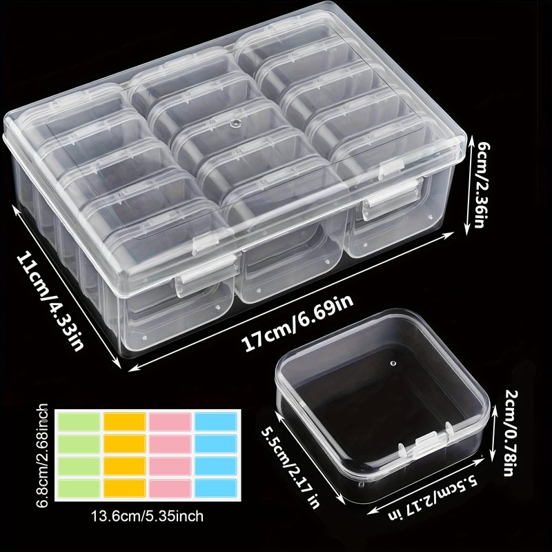 - Optimal Storage Capacity: This transparent organizer container, measuring 17.4×12.4×5.8cm, comes with 15 inner cases (5.3×5.3×0.8cm), providing ample space to neatly store jewelry, craft supplies, DIY rhinestones, beads, bolts, and nuts.