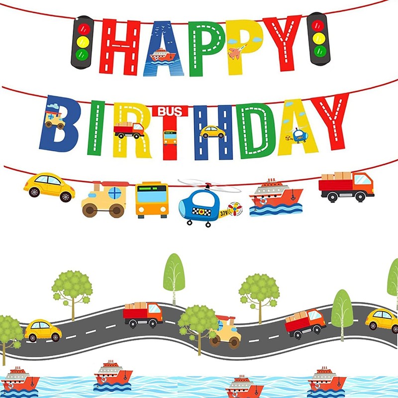 - 【Package Include】: 1 set transportation happy birthday banner and 1 set transportations strand of ship, bus, train, helicopter and car and 1pc ribbon