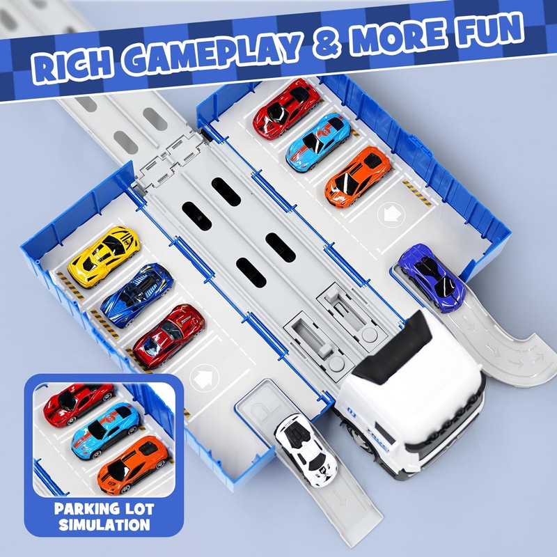 - Large Capacity Truck Toy: Double-layer foldable race track design can easily accommodate all cars and accessories, providing a spacious parking or toy car garage experience. The retractable handle on the top is convenient for kids to carry and experience the fun of the game at any time!