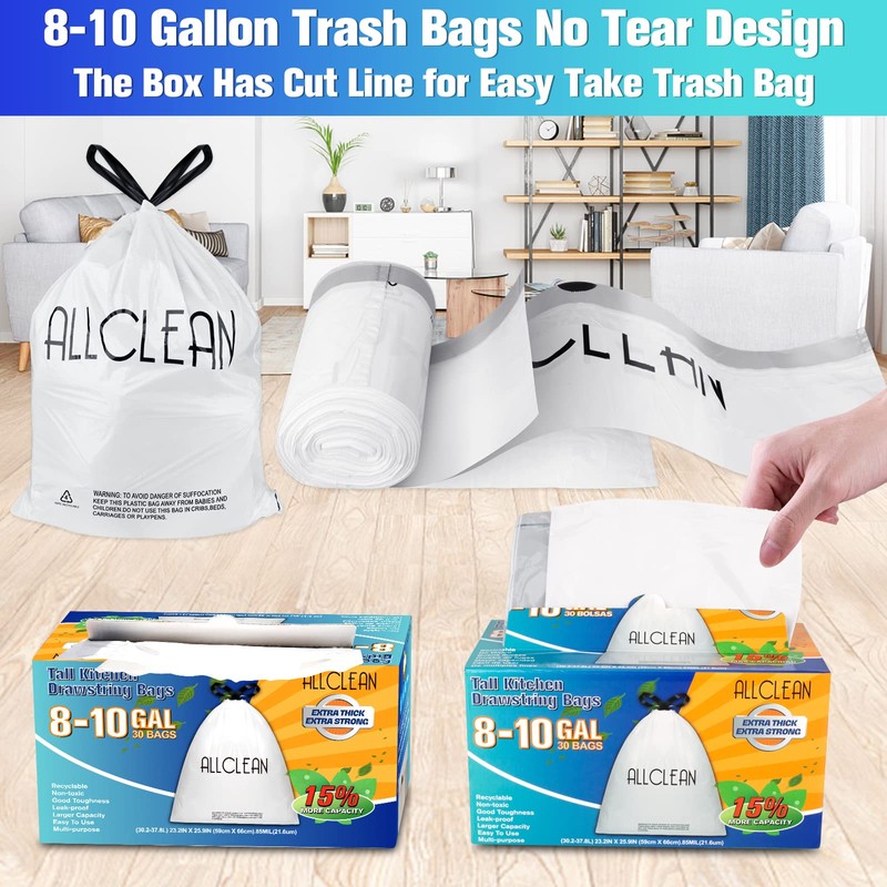 - Careful Design & Warm Service: Exquisite and meticulous packaging and bilingual design (in English and Spanish), your box can be used for other purposes after using up the garbage bags. 30 Counts unscented 8-10 gallons white drawstring trash bags included on one box. Bag dimensions equal 23inches wide by 26inches tall, 38 liters. It makes our trash bags easy to tie up and throw out. If you aren’t satisfied, please let us know.