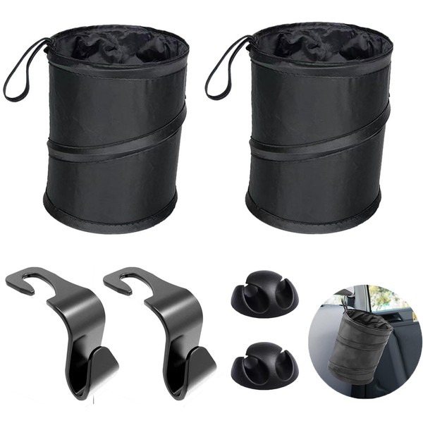 Car Trash Can, Portable Garbage Bin, Collapsible Pop-up Water Proof Bag, Waste Basket Bin, Rubbish Bin (2 Pack, Black) with 2 Car Seat Hooks 2 Cable Clips