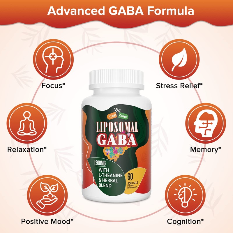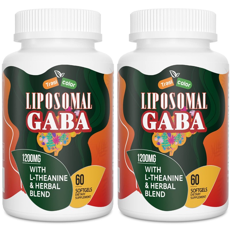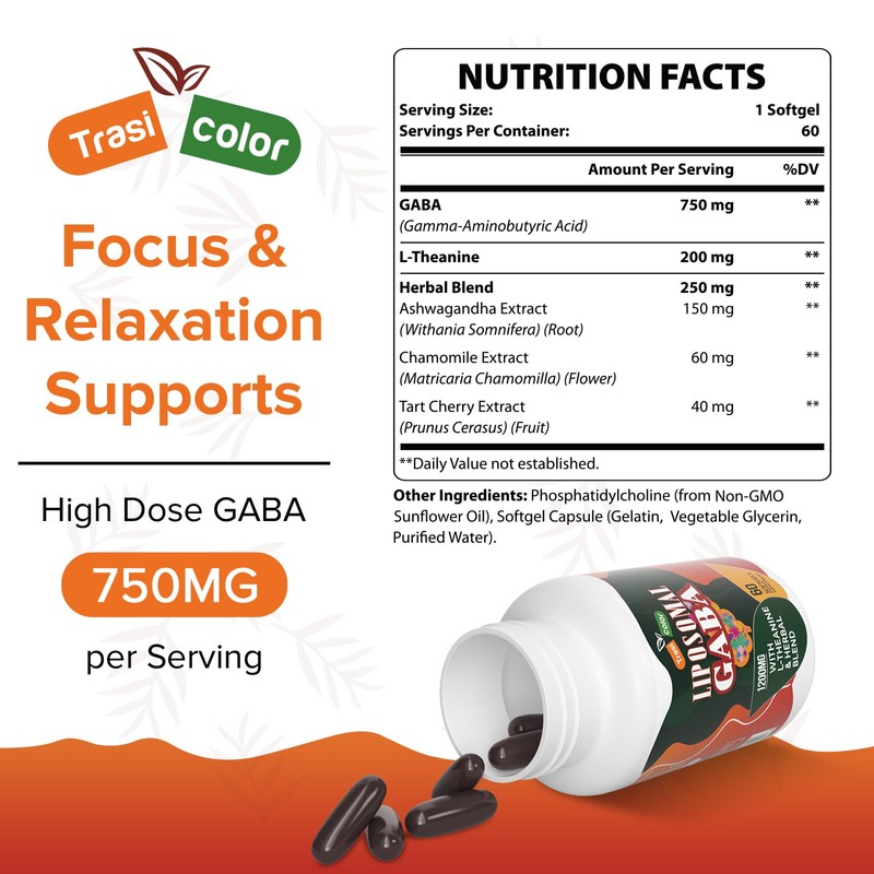 Trasicolor Liposomal GABA with L-Theanine Supplements 1200mg - High Absorption GABA Complex with Ashwagandha, Chamomile, Tart Cherry Herbal Supplements for Men and Women, 120 Softgels