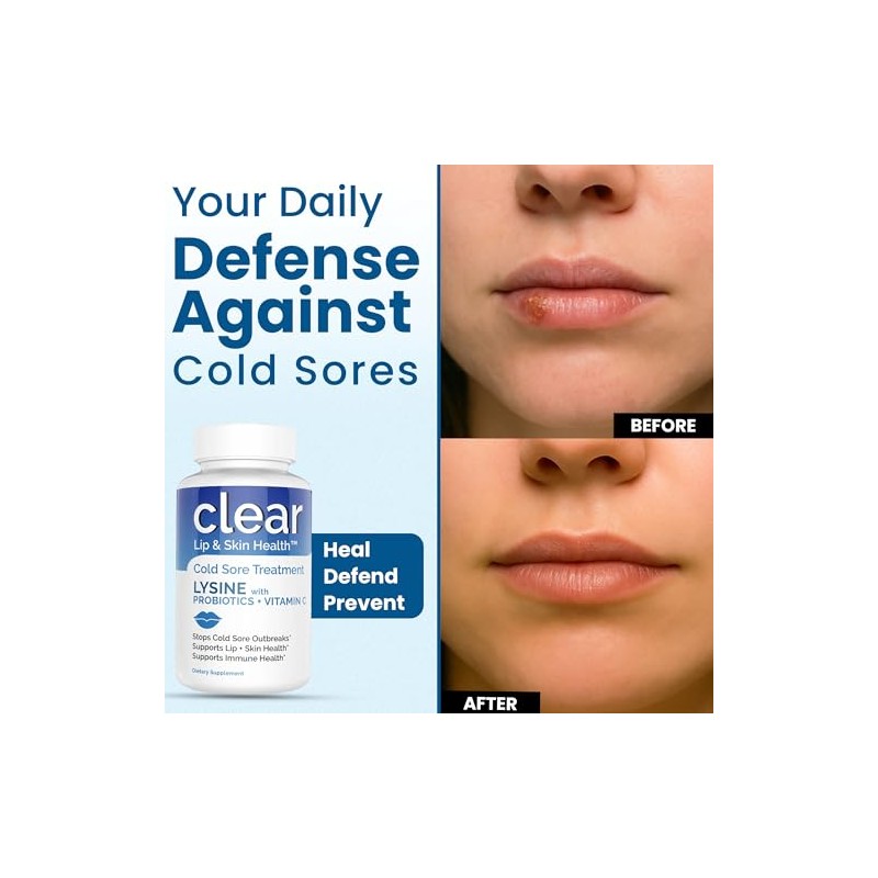 Clear Probiotics - Tratamiento de lisina para el herpes labial con preprobióticos y VIT C | Suministro de 1 mes | Cápsulas de lisina supercargadas con Rhamnosus y Acidophilus para aliviar el herpes labial, la piel + la