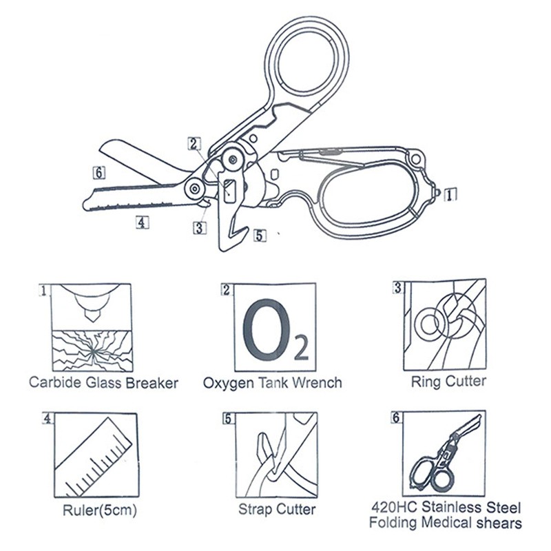 - Practical equipment for paramedics and fire brigade - Designed with emergency services professionals in mind, Ziyero folding scissors offer the most important gadgets for any situation, including a folding emergency scissors, a tape cutter, a ring cutter, a ruler, an oxygen tank key and a carbide glass breaker.