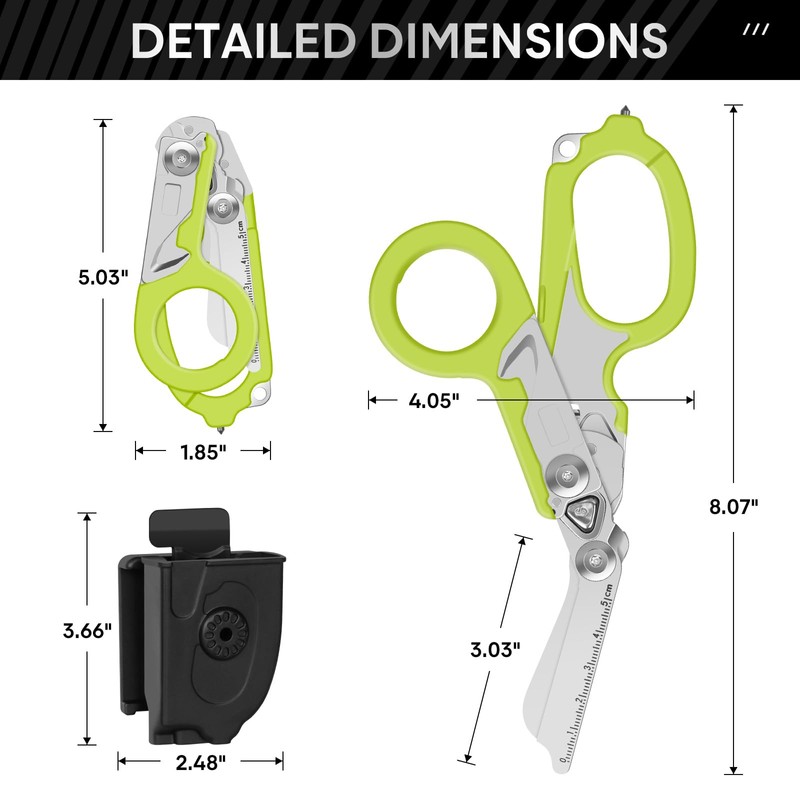 - APPLICATION:This trauma shears comes with a holster, small size, light weight, easy to carry. When you go out, you can use the lanyard to hang the folding scissors on your hand, or you can put the scissors in the holster, hang it on your belt, or put it in your bag or pocket, very lightweight and convenient for you to use in emergency situations.