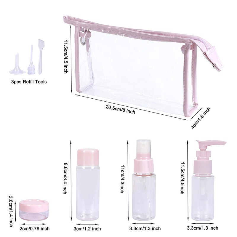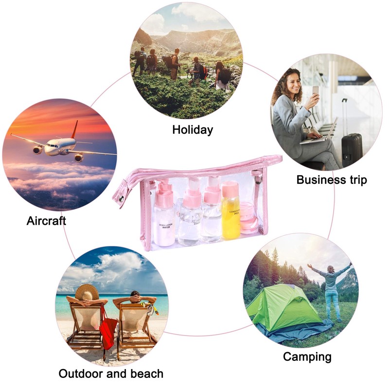 3. The travel bottle kit is made of high quality PET with secure closures included in a transparent zip bag. Help your cosmetics not leak or spill.